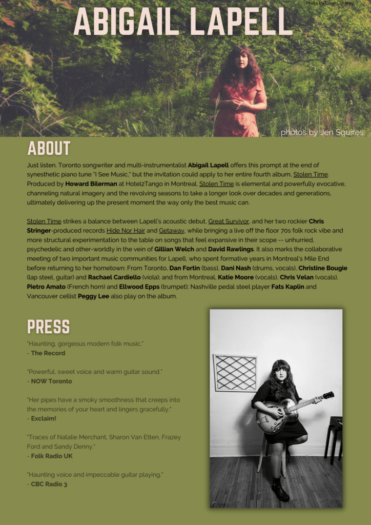 Her newest album Stolen Time is out April 22 via Outside Music (and is partially funded by FACTOR, the Government of Canada, and Canada’s private radio broadcasters!). She has also won two Canadian Folk Music Awards and held the #1 spot on the Canadian folk radio chart.