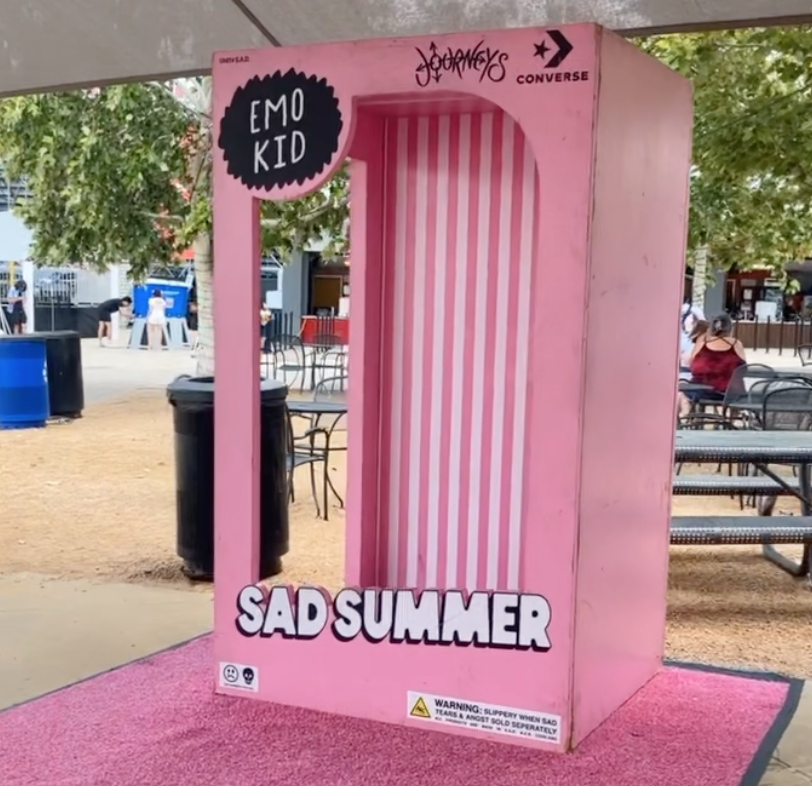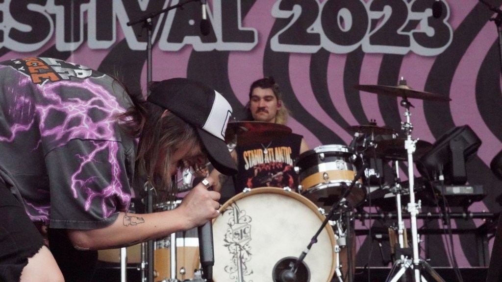 Next up was Stand Atlantic from Sydney. No stranger to The Emo Diaries, I was hyped to see them live. They’re also led by a female vocalist, Bonnie Fraser, who sported a trucker hat, oversized tee, and black jeans. (just as an aside here, I know we were at an emo festival but I truly do not understand how so many of these artists wore long pants and head-to-toe black. just… no) Every artist commented on the heat, and Bonnie tried to beat it by doing a shoey. She did mention how disgusting it is to do a shoey out of a real shoe, so she used a little shoe-shaped koozie which was honestly so cute and they should sell them. Maybe they did, I didn’t spend much time at the merch tables tbh.