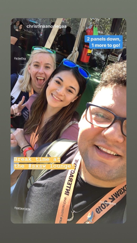Leading up to the festival, each of us wrote six “previews” – interviews with speakers about their panels, what we could expect, and just a little more about them as people. As the keeper of the Twitter account, I pushed these stories out on social after being posted. During the festival, we were to attend at least five days of programming, utilize our Instagram Stories, and live Tweet during the panels we attended. At the end of each day, we would compose “wrap-ups” consisting of our Instagram Story of the day and a quick blurb about the experience. It was my job to retweet pertinent information to the @sxtxstate Twitter account as well as retweet my fellow team members during the festival.